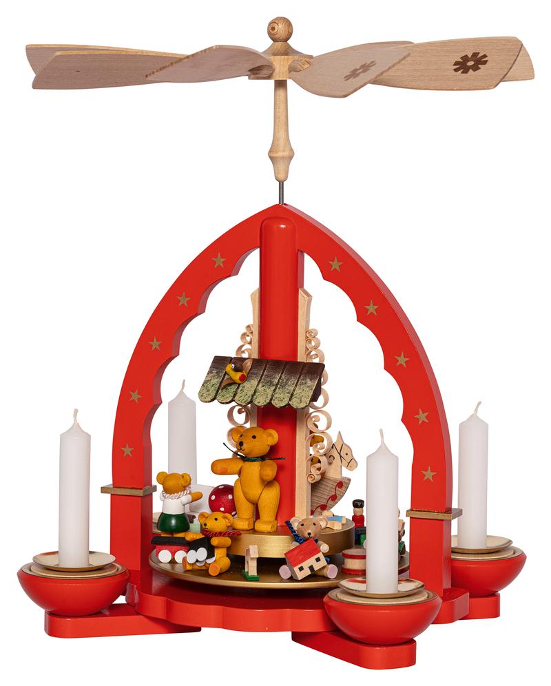 Handcrafted wooden Christmas pyramid featuring a charming teddy bear and toy scene. Lit candles create rising warmth that gently spins the fan wheel and moves the figures.