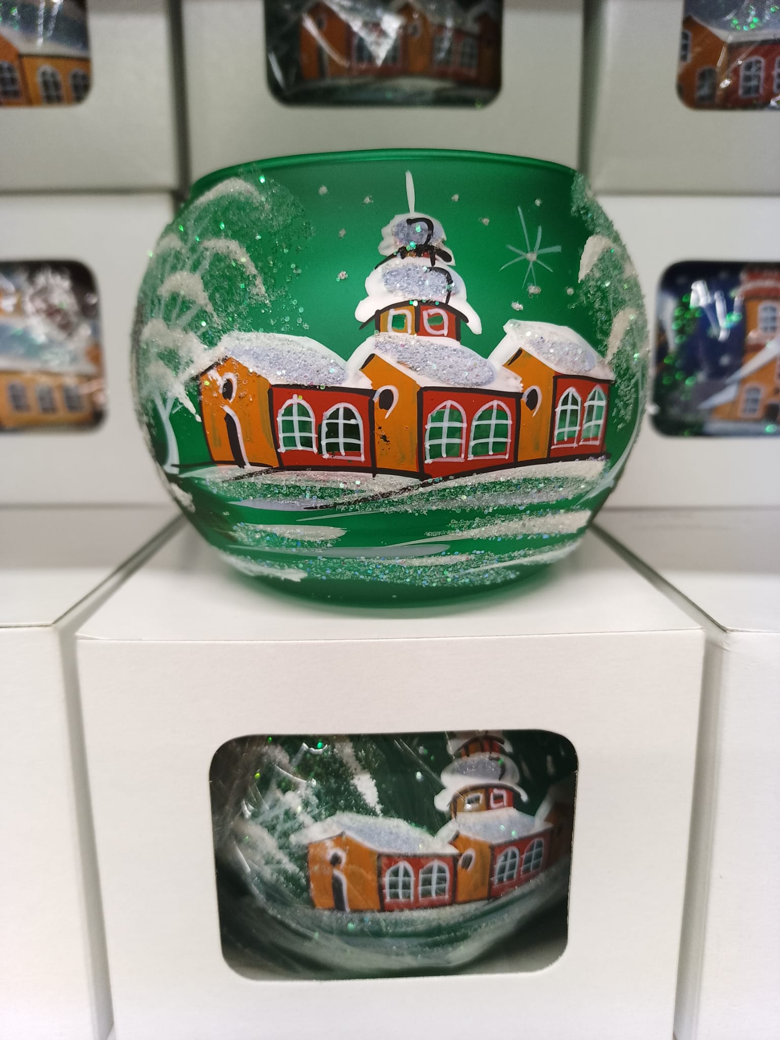Christmas Tealight Candle Holder green: Glass Lantern, mouth blown and hand painted in Germany. And it comes in it's own individual dislay box.