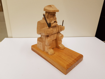 The figure wears a cap and has a thick beard, giving him a rustic, folk-art look.
