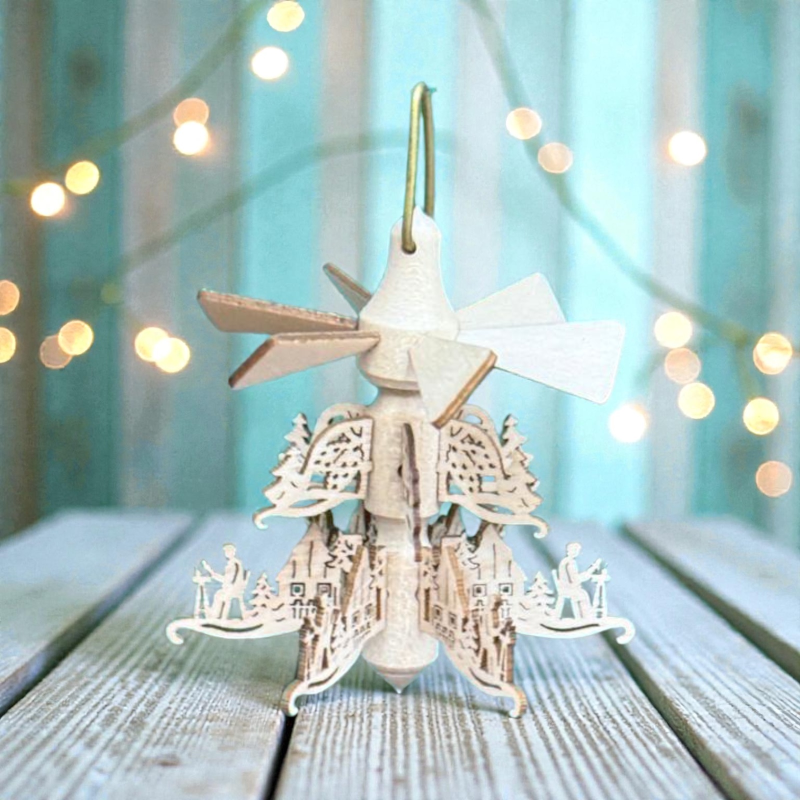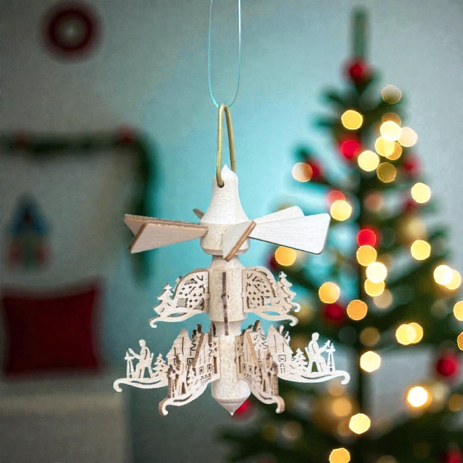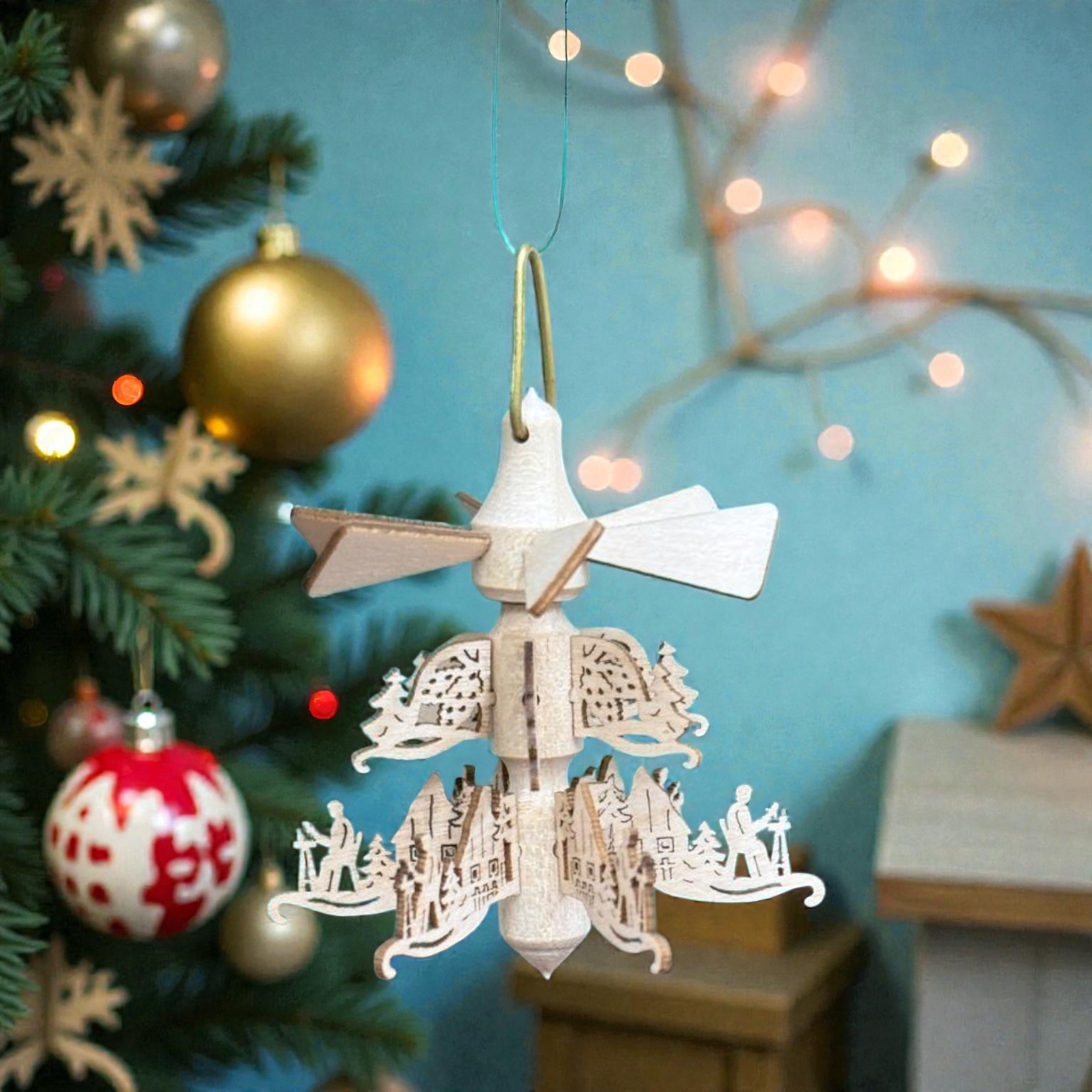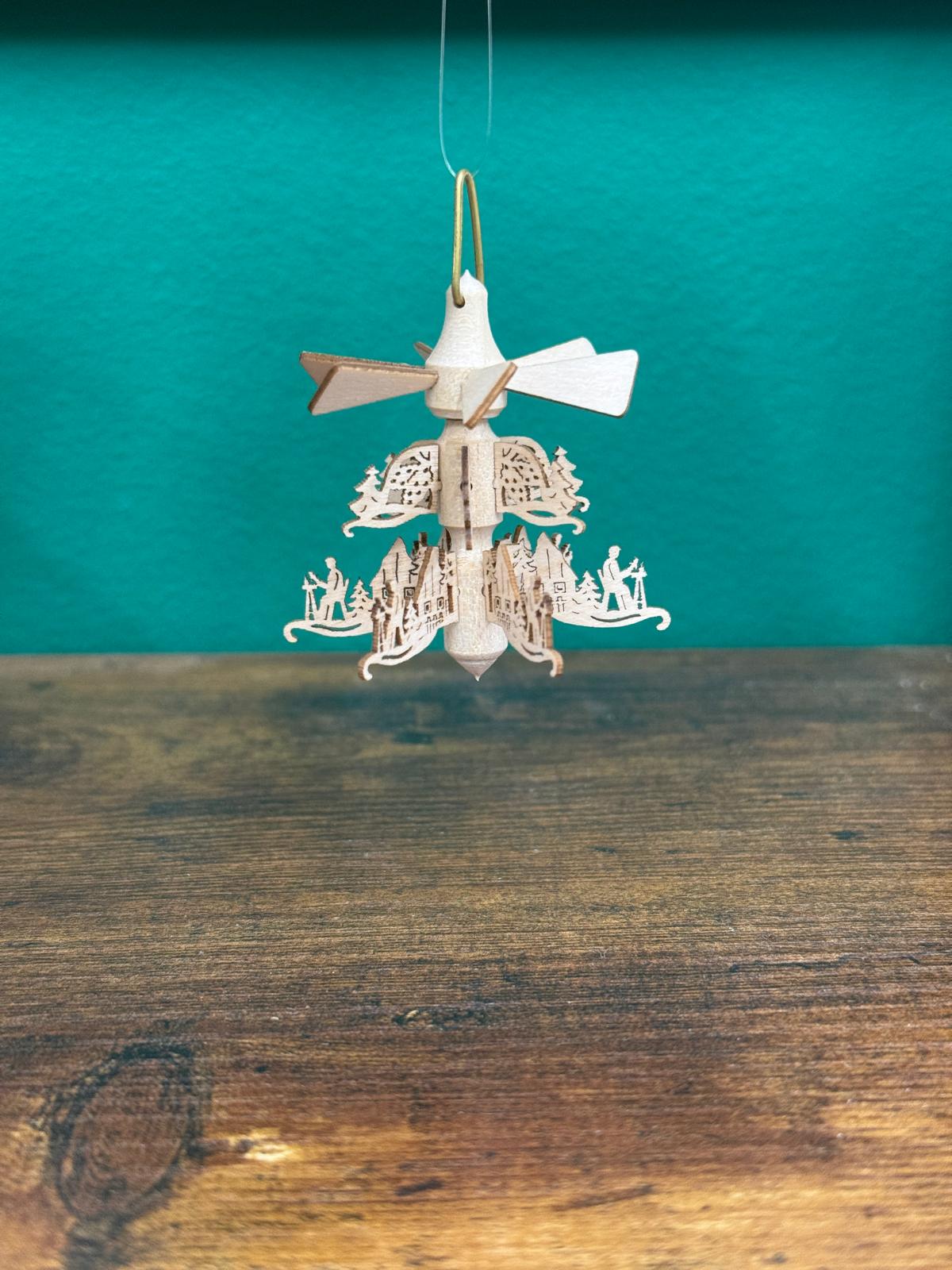 A beautifully detailed hanging Christmas pyramid ornament, crafted from natural wood in the Erzgebirge region of Germany. Its delicate village and forest silhouettes, paired with the tiny spinning fan, bring traditional holiday charm to any tree.