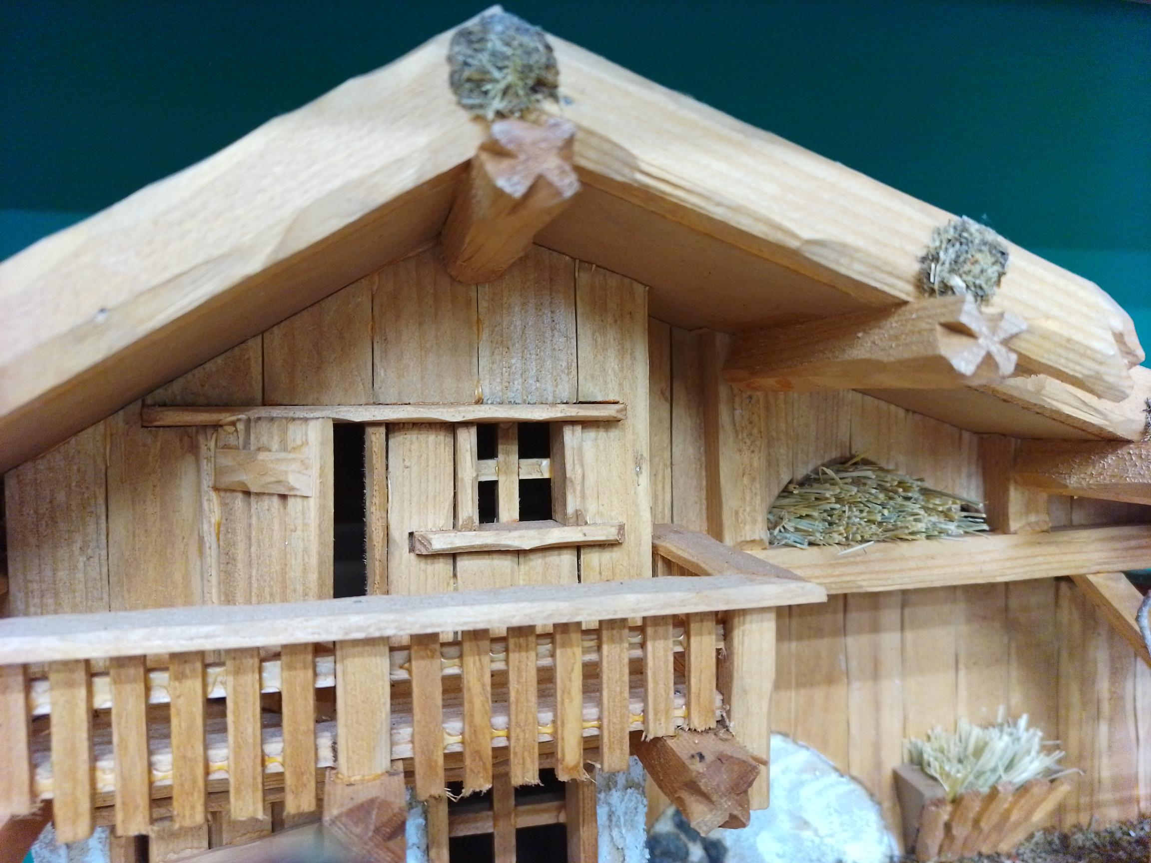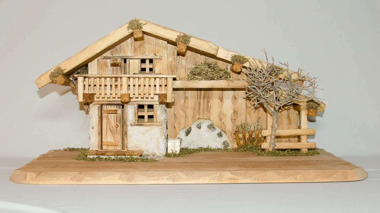 Handcrafted nativity stable St. Ulrich with shingled roof, balcony, and natural decorations.