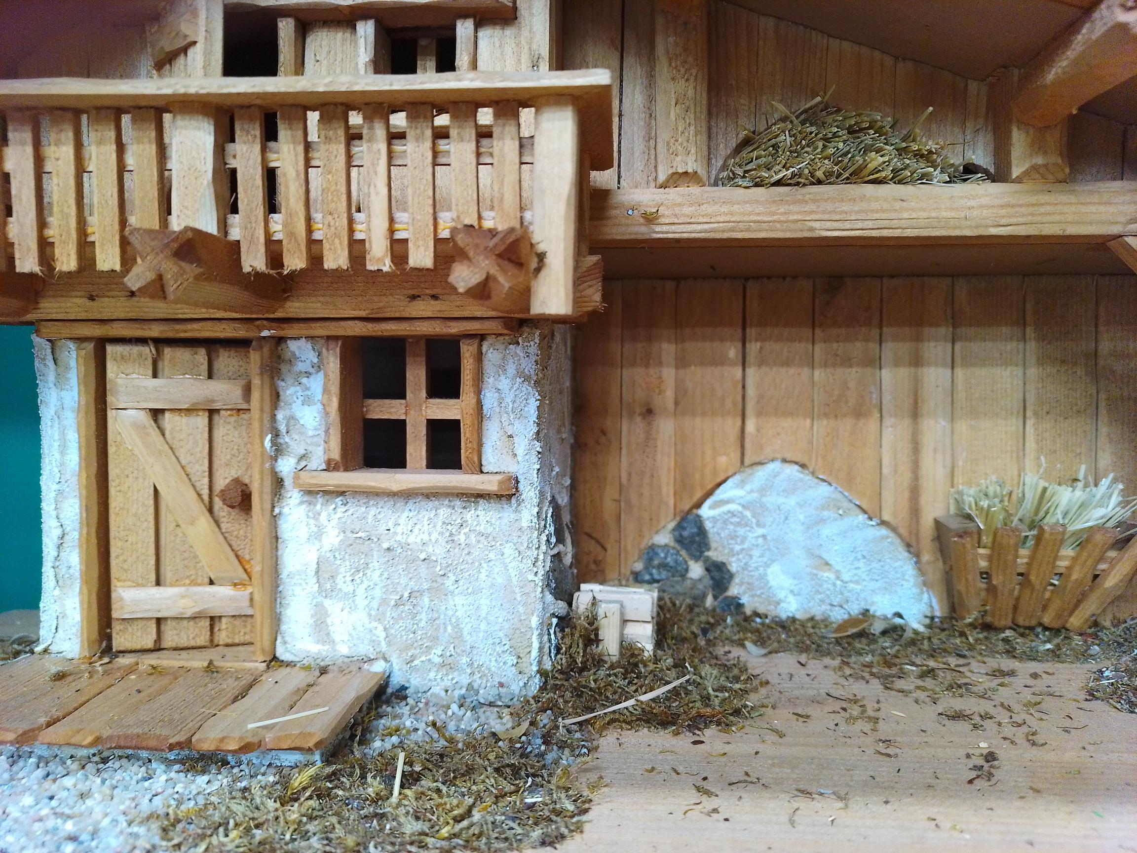 Made from stained and partially plastered plywood, this stable features a detailed shingled roof, rustic walls, and natural decorations such as moss, bark, and straw. The small window, balcony railing, and natural textures add authenticity and depth, turning the stable into a timeless piece of craftsmanship.