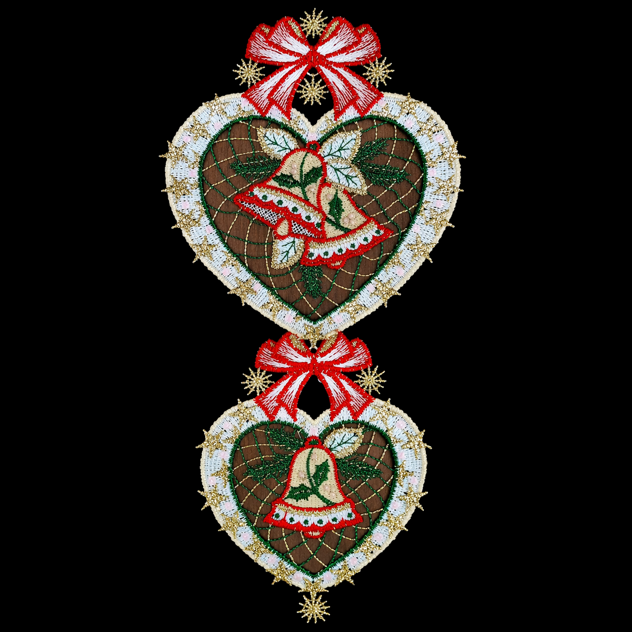 Window Hanging Heart Band 07-4185: Window hangings or window pictures have a long history. Since the High Middle Ages at the latest, window pictures made of leaded glass have adorned churches and town halls. They depict history and stories and give the window representative power. So it is not at all surprising that windows have been decorated in private households for centuries. In window pictures made from Plauen lace (Plauener Spitze), two traditions meet in the here and now and complement each other to create a diverse range of window decorations made from real lace, which offers something suitable for many occasions. Feel free to browse through our range of genuine Plauen lace window pictures.