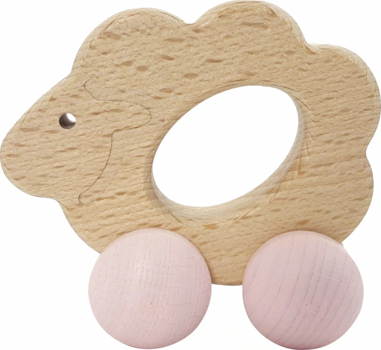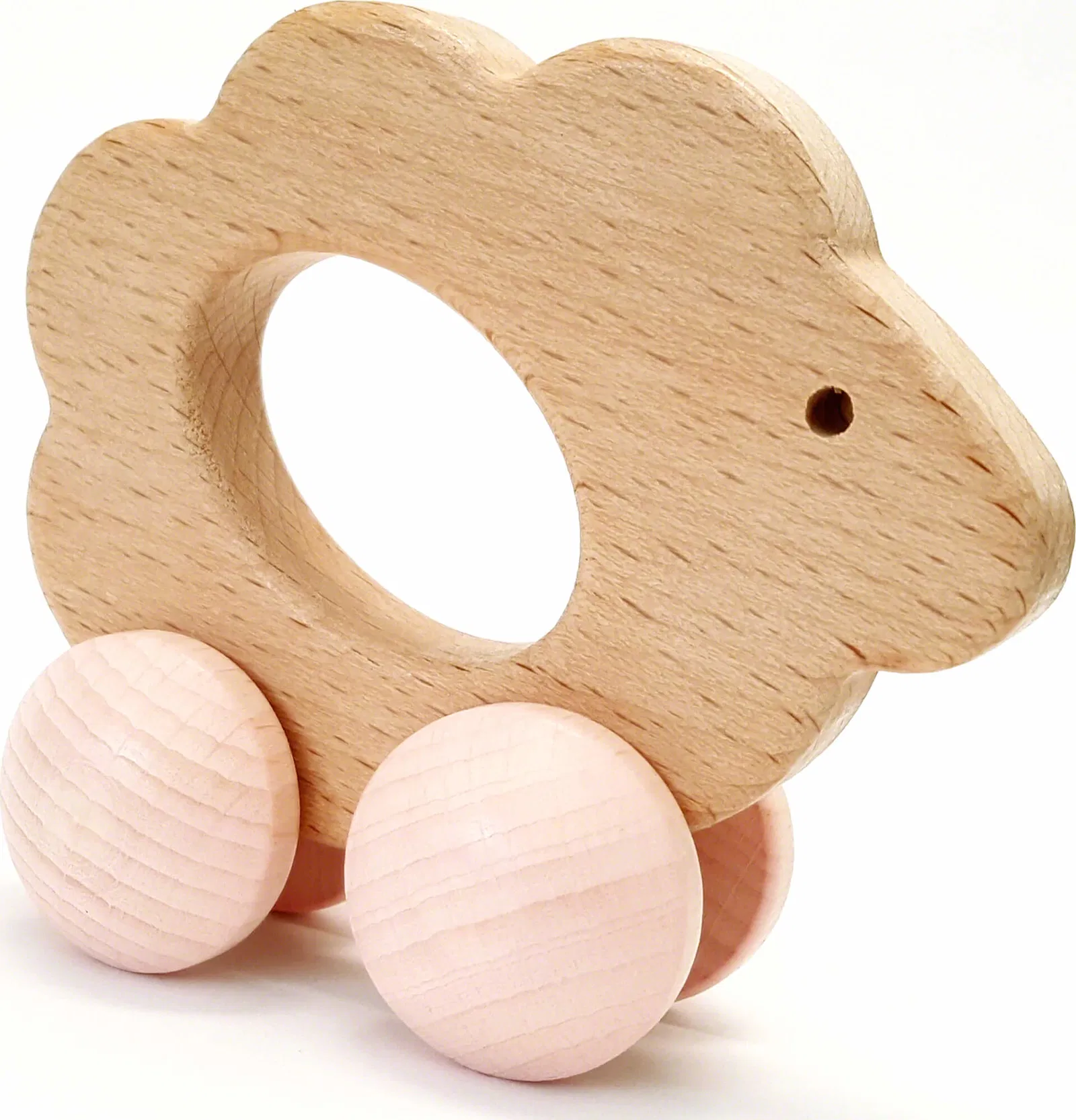 A beautifully simple wooden rolling toy, crafted in a smooth, natural finish, designed perfectly for little hands to grasp and explore. The rounded shape and large center opening make it easy for children to hold, encouraging motor skill development and imaginative play. Soft, pastel-colored wheels add a gentle touch of color while maintaining a calm, modern look.